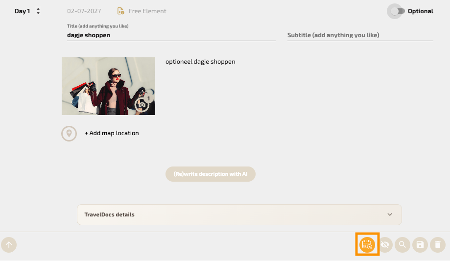 A free element is designed to add extra information outside the standard day structure of your tour. Think of an informational message such as “You have arrived at the next destination and tomorrow you will go on an excursion” or general notes that are not directly tied to a specific day.