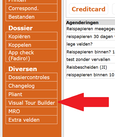- Ga in de menubalk naar Diversen → Visual Tour Builder (deze optie is alleen zichtbaar als de koppeling is geactiveerd. Niet zichtbaar? Vraag de beheerder van het BAS account om de koppeling te activeren).