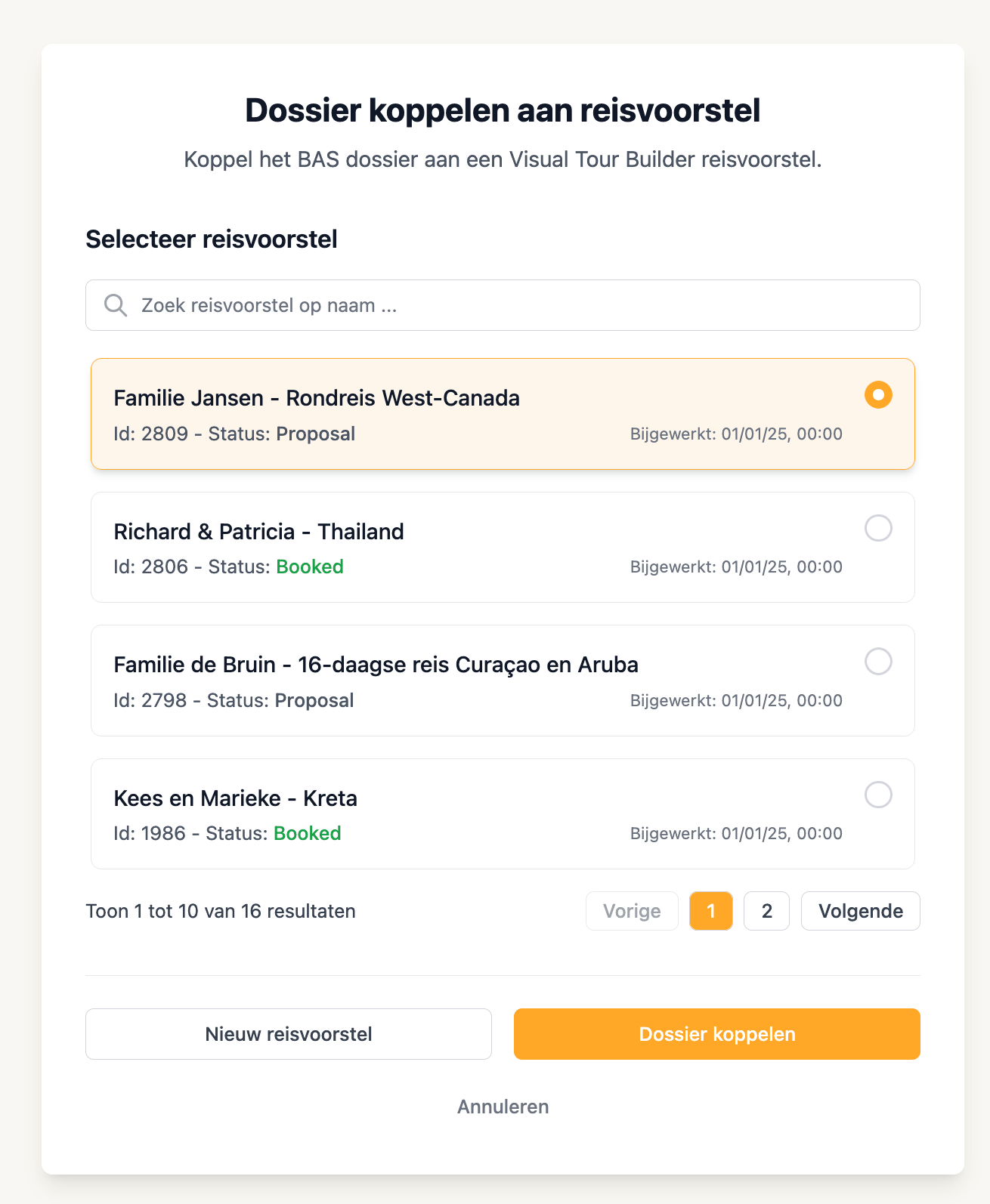De geselecteerde reisvoorstellen worden nu gekoppeld aan het betreffende BAS-dossier.