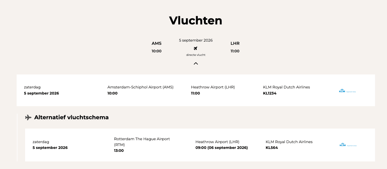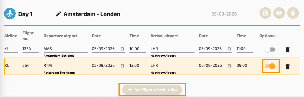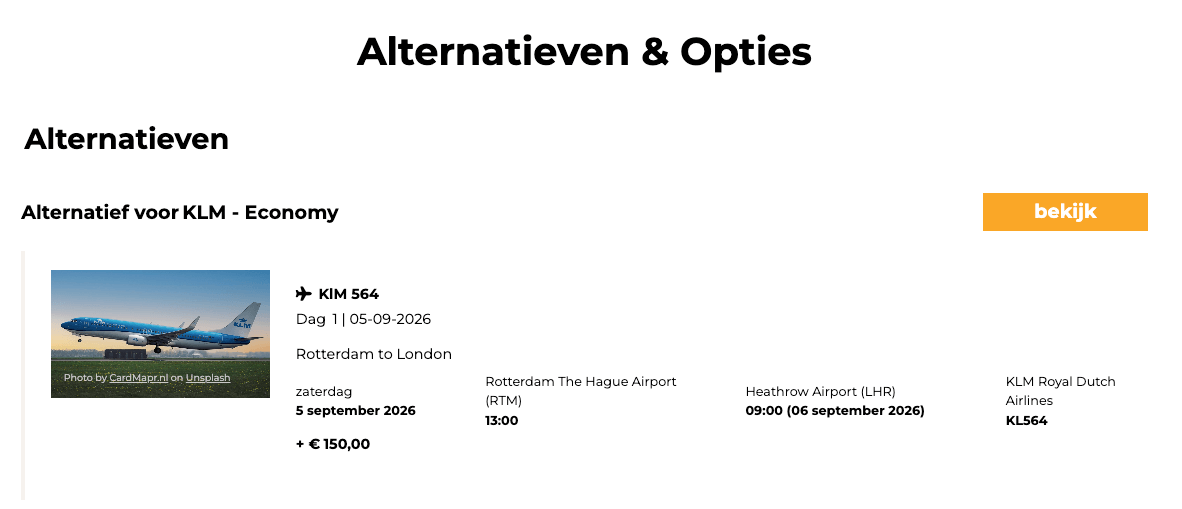This feature shows you to offer an alternative flight within a trip. For example, you can offer departure from Amsterdam Airport instead of Rotterdam, or provide a later flight on the same day.
