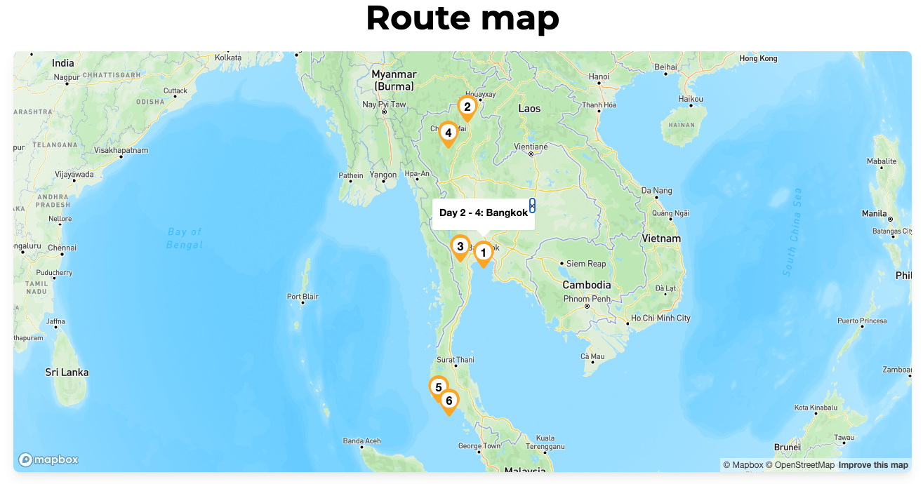 In the output, the map will appear above the Trip Description. The numbers in the markers indicate the order of the trip (i.e., the destination blocks with markers). When you click on a marker, the title and corresponding days of the Destination Block will be displayed. The customer can drag the map and zoom in and out. The default zoom level of the map is dynamically determined based on the size of the area the trip covers.