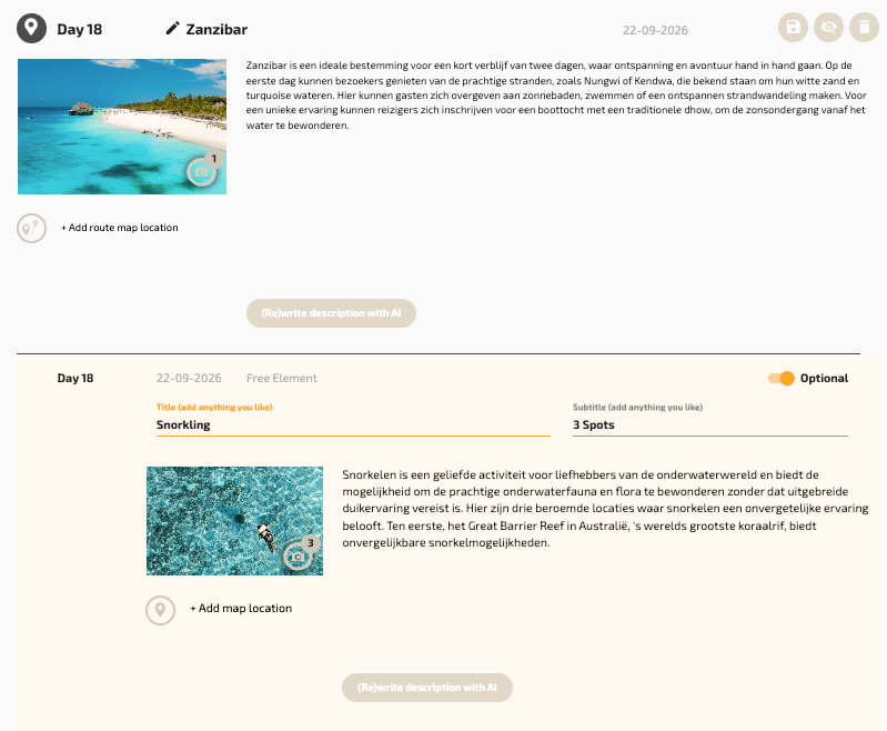 These Free elements are displayed independently and are not linked to a specific day in the itinerary. For each Free element, you can choose whether it is Included in the trip or Optional