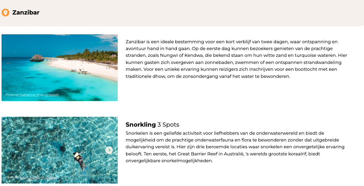 In the final output, these excursions or activities appear as part of the destination information, without being attached to a specific travel day.